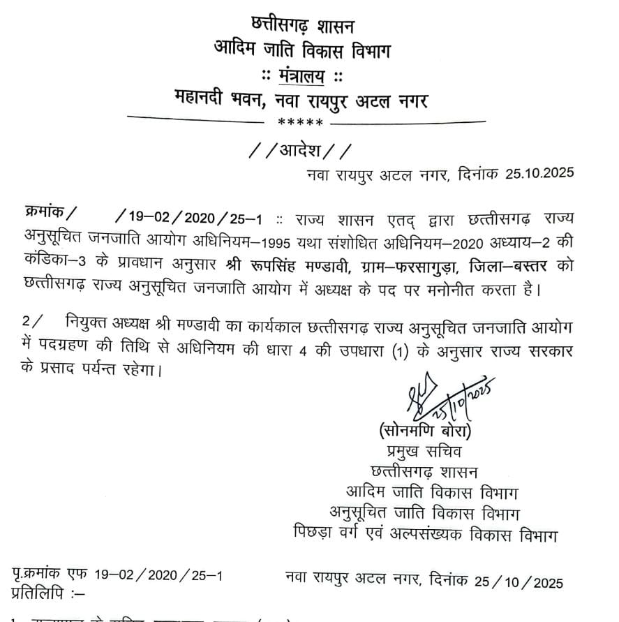 CG ब्रेकिंग : छत्तीसगढ़ अनुसूचित जनजाति आयोग के नए अध्यक्ष का ऐलान, बस्तर के इस बड़े नेता को मिली जिम्मेदारी