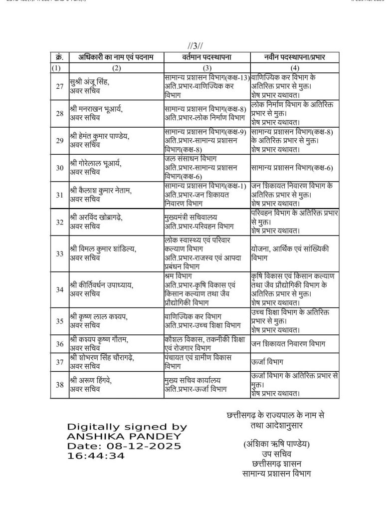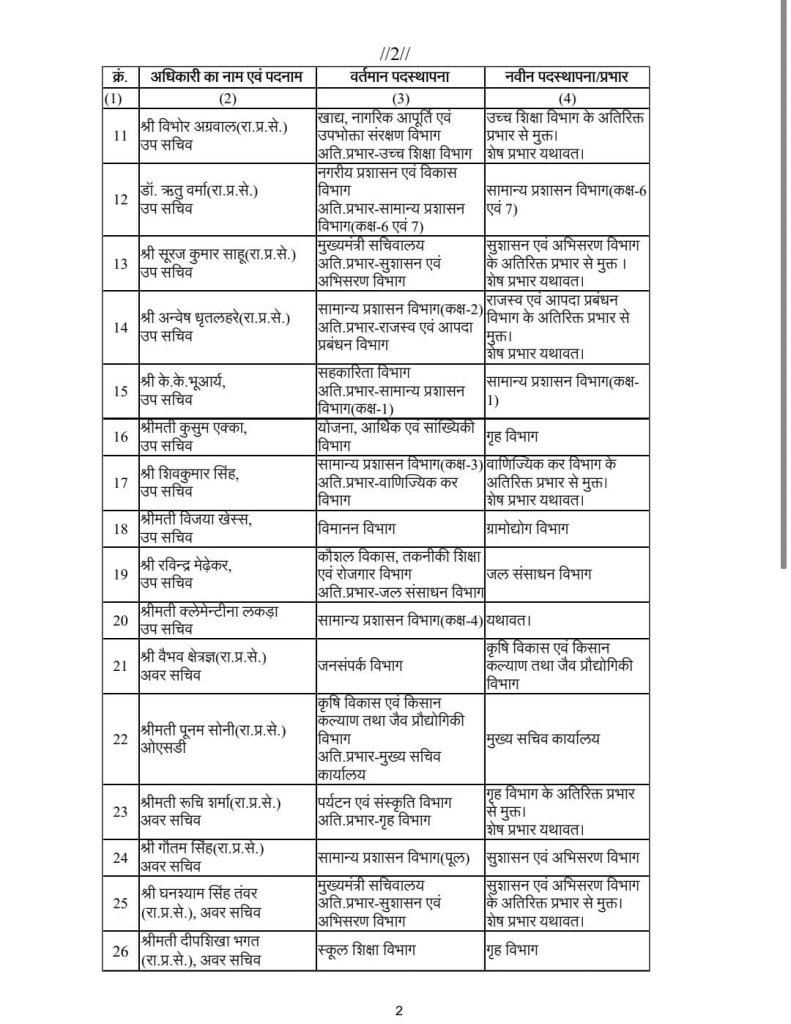 रायपुरः छत्तीसगढ़ में एक बार फिर प्रशासनिक फेरबदल हुआ है। राज्य सरकार ने राज्य प्रशासनिक सेवा के एक साथ अधिकारियों का एक साथ तबादला किया है। इस संबंध में सामान्य प्रशासन विभाग ने आदेश जारी किया है। जारी आदेश में कुल 38 अधिकारियों का नाम शामिल है।