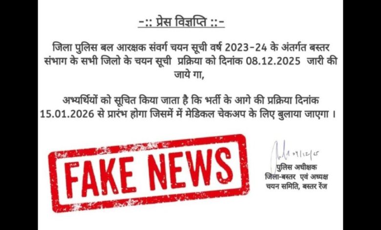 जगदलपुर | बस्तर से एक अहम जानकारी सामने आई है, जहां सोशल मीडिया पर वायरल एक कथित प्रेस विज्ञप्ति ने अभ्यर्थियों में भ्रम की स्थिति पैदा कर दी है। इस फर्जी विज्ञप्ति में दावा किया गया है कि वर्ष 2023-24 की जिला पुलिस बल आरक्षक भर्ती की चयन सूची 8 दिसंबर को जारी होगी और मेडिकल टेस्ट 15 जनवरी से शुरू किए जाएंगे। इस भ्रामक दस्तावेज को बस्तर एसपी के नाम से जारी किया गया बताया गया है, लेकिन पुलिस ने इस विज्ञप्ति को पूरी तरह फर्जी बताते हुए इंडेंटिफाई किया है।