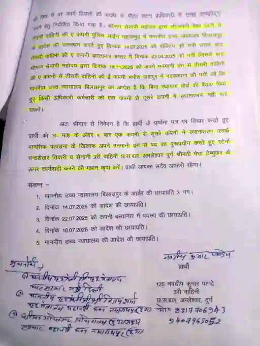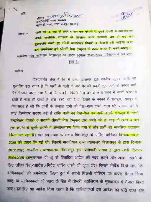 जवान ने विभागीय स्टेनो चंद्रशेखर तिवारी और कमांडेंट मेघा टेम्भूरकर पर मानसिक प्रताड़ना देने का आरोप लगाया है। उनका कहना है कि वह सिर्फ पोस्टिंग ही नहीं, बल्कि मनोवैज्ञानिक दबाव का भी सामना कर रहे हैं।