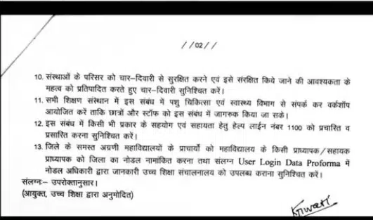 कॉलेज-विश्वविद्यालय के प्रोफेसर और सहायक प्रोफेसर इस बात का भी ध्यान रखेंगे कि कहीं परिसर में ऐसी कोई खाद्य सामग्री तो नहीं खुले में पड़ी है, जिससे आवारा पशु आकर्षित होते हैं। परिसर में आवारा पशुओं के प्रवेश को प्रतिबंधित और नियंत्रित करने के लिए इसकी लगातार निगरानी की जाएगी।