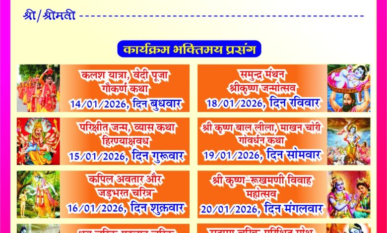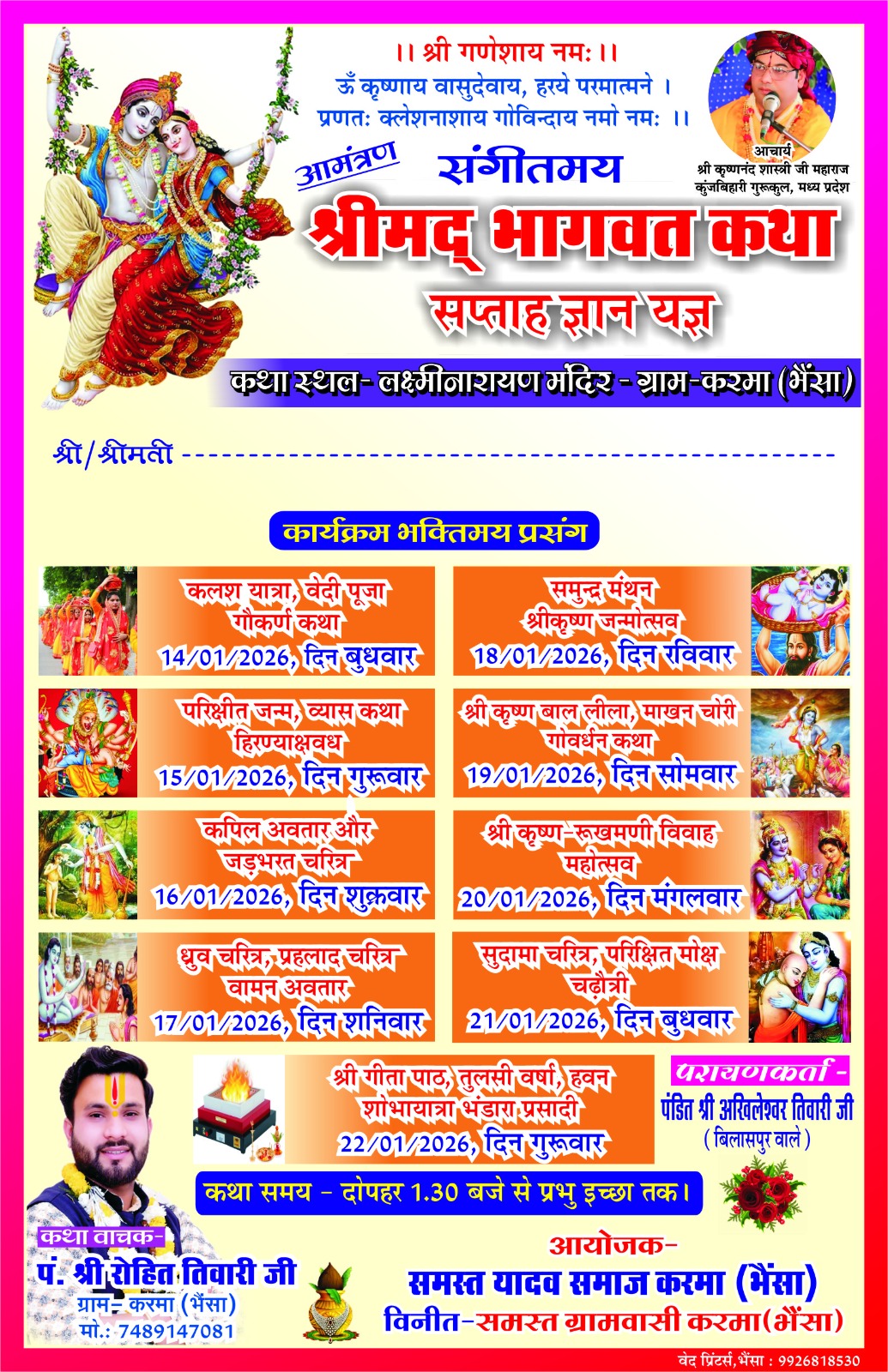 श्रीमद भागवत कथा का आयोजन करमा मे 14 जनवरी से