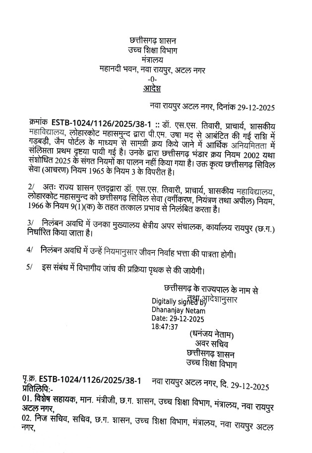 जारी आदेश के अनुसार प्राचार्य डॉ. एस.एस. तिवारी पर पीएम-उषा मद के अंतर्गत आवंटित राशि में गड़बड़ी तथा वित्तीय नियमों के उल्लंघन का प्रथम दृष्टया दोष पाया गया है।इसी तरह पिथौरा महाविद्यालय में पीएम-उषा मद से प्राप्त राशि के अंतर्गत मिड-डे के दौरान जेम पोर्टल के माध्यम से किए गए क्रय में छत्तीसगढ़ भंडार क्रय नियम, 2002 एवं संशोधित 2025 के प्रावधानों का पालन नहीं किया गया। प्रारंभिक जांच में यह कृत्य छत्तीसगढ़ सिविल सेवा (आचरण) नियम, 1965 के उल्लंघन के दायरे में पाया गया है।