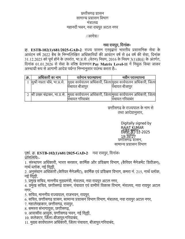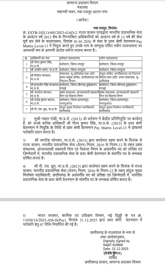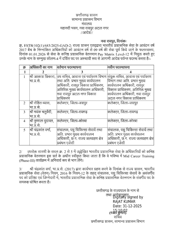 वहीं 2017 बैच के पांच आईएएस अधिकारियों को संयुक्त सचिव के पद पर पदोन्नत किया गया है। इनमें आकाश छिकारा, रोहित व्यास, मयंक चतुर्वेदी, कुणाल दुदावत और चंद्रकांत वर्मा शामिल हैं। इस बैच के तीन अधिकारी वर्तमान में जिला कलेक्टर के रूप में कार्यरत हैं—रोहित व्यास जशपुर, मयंक चतुर्वेदी रायगढ़ और कुणाल दुदावत कोरबा जिले की जिम्मेदारी संभाल रहे हैं। वहीं 2022 बैच के दो अफसरों को भी पदोन्नत किया गया है।