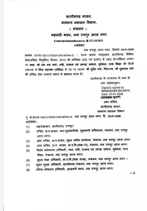 रायपुर। छत्तीसगढ़ सरकार में प्रशासनिक स्तर पर एक और बड़ा बदलाव सामने आया है। राजस्व मंत्री टंकराम वर्मा ने अपने निजी सहायक दुर्गेश धारे को पद से हटा दिया है। इसके साथ ही उनकी सेवाएं भी समाप्त कर दी गई हैं। बताया जा रहा है कि दुर्गेश धारे संविदा पर कार्यरत थे।