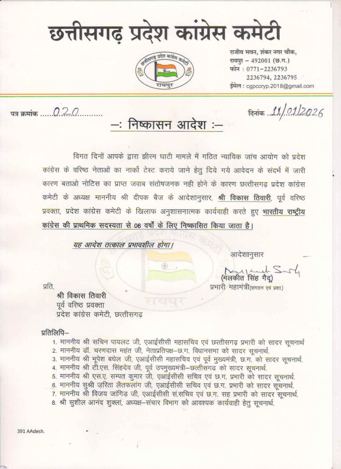 विकास तिवारी की तरफ से कारण बताओ नोटिस का जवाब भी दिया गया, लेकिन पार्टी के वरिष्ठ नेताओं को विकास तिवारी का जवाब संतोषजनक नहीं लगा। इसके बाद छत्तीसगढ़ कांग्रेस के प्रभारी महामंत्री मलकीत सिंह गेंदू ने आदेश जारी करते हुए विकास तिवारी को 6 साल के लिए कांग्रेस से निष्कासित कर दिया है।