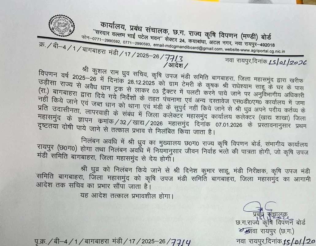 नियमों की खुलेआम अनदेखी और किसानों के हितों के साथ खिलवाड़ को गंभीरता से लेते हुए कलेक्टर लंगेह ने समिति प्रबंधक को तत्काल निलंबित करने के निर्देश दिए। साथ ही पूरे मामले में एफआईआर दर्ज कर दोषियों के खिलाफ कानूनी कार्रवाई सुनिश्चित करने को कहा गया। इसी तरह महासमुंद जिले की कृषि उपज मंडी समिति बागबाहरा में भी बड़ी प्रशासनिक कार्रवाई की गई है। मंडी समिति के सचिव कुशल राम ध्रुव को निलंबित कर दिया गया है। यह कार्रवाई छत्तीसगढ़ राज्य कृषि विपणन मंडी बोर्ड के प्रबंध संचालक द्वारा की गई।