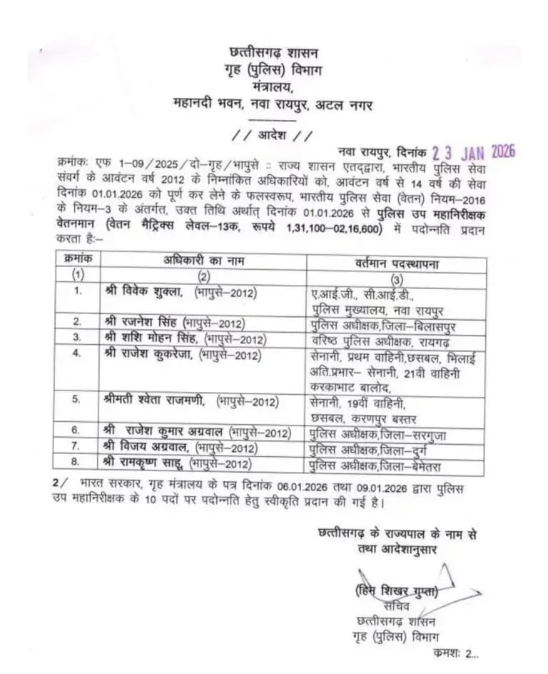 आईपीएस रजनेश सिंह, शशिमोहन सिंह, राजेश अग्रवाल और विजय अग्रवाल समेत 8 अफसरों को प्रमोट कर डीआईजी बना दिया गया है। सेलेक्शन ग्रेड मिलने के बाद जिलों में पोस्टेड एसपी का पदनाम बदलकर एसएसपी हो जाएगा। इनमें जितेंद्र शुक्ला, मोहित गर्ग, यशपाल सिंह, अभिषेक पल्लव और भोजराम पटेल शामिल हैं। भोजराम इस समय मुंगेली के एसपी हैं। हालांकि इन अफसरों को अभी नई जगहों पर पोस्टिंग नहीं दी गई है।