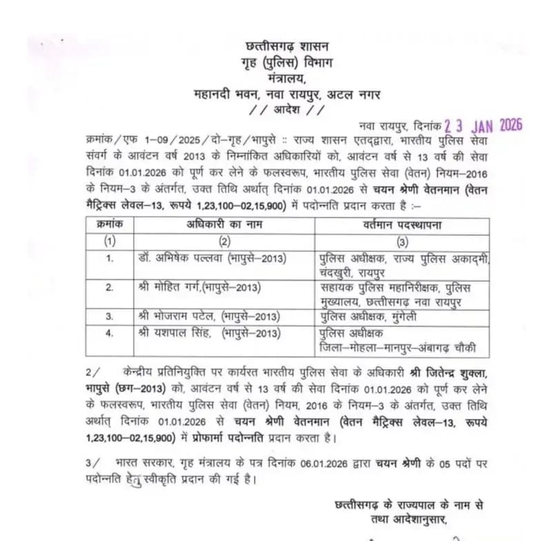 इसी तरह कल यानी शुक्रवार को प्रदेश के सीनियर आईपीएस अफसरों को प्रमोशन दिया गया है। जारी पदोन्नति आदेश के मुताबिक 2001 बैच में एडीजी बनने वालों में डॉ. आनंद छाबड़ा को आईजी से एडीजी प्रमोट किया गया है। वहीं 2008 बैच में प्रशांत अग्रवाल, मिलना कुर्रे, नीथू कमल और डी. श्रवण को आईजी प्रमोट किया गया है।
