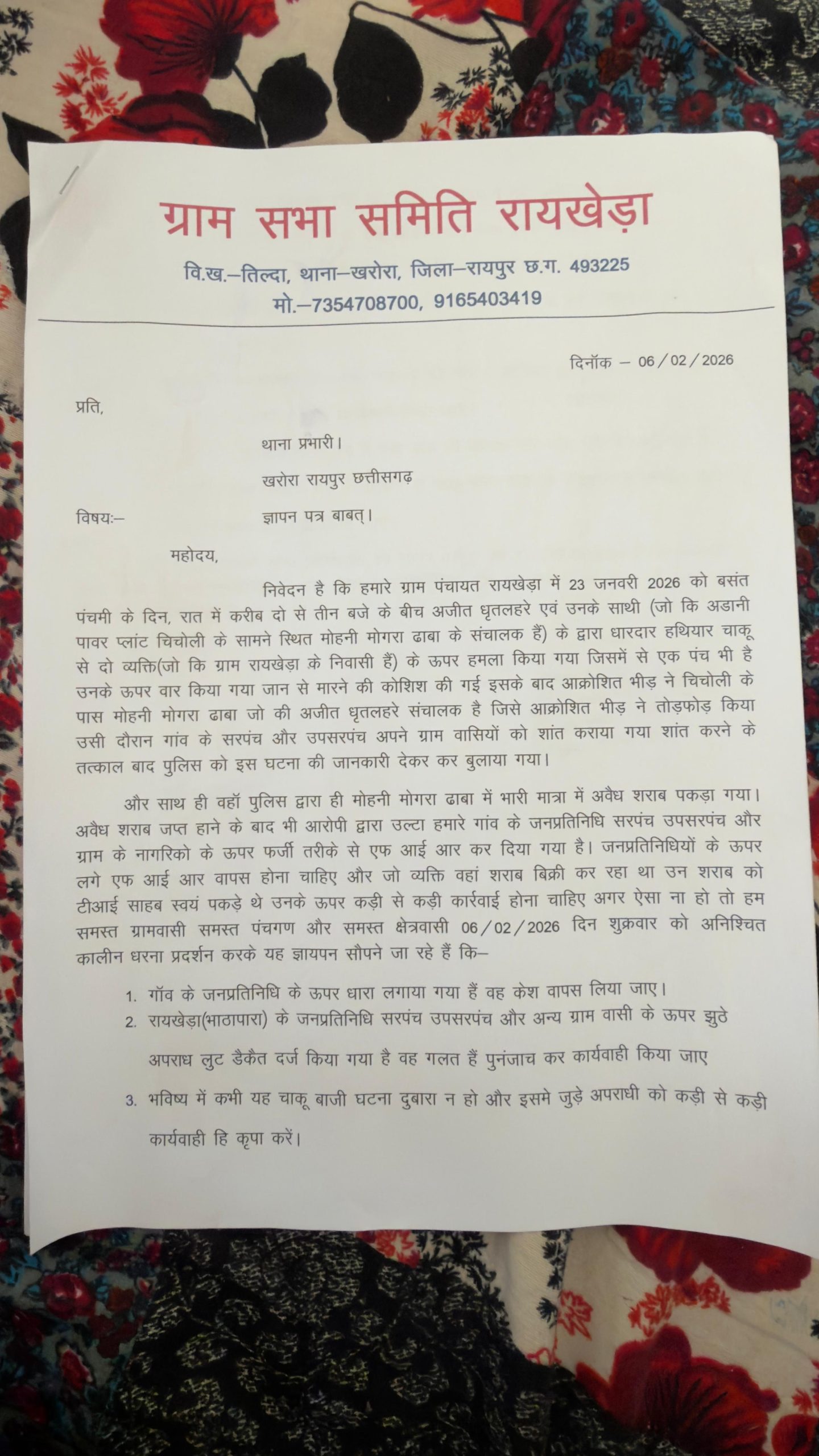 तिल्दा /खरोरा : सरपंच संघ के अध्यक्ष के नेतृत्व में सरपंच एवं रायखेडा के ग्राम वासियों ने थाना खरोरा का किया घेराव खरोरा क्षेत्र में बढ़ती हुई नशे व सरपंच रायखेडा के ऊपर डकैती झूठे आरोप पर रिपोर्ट दर्ज किए जाने तिल्दा ब्लॉक के सरपंच संघ अध्यक्ष के नेतृत्व में सरपंच संघ एवं रायखेड़ा के ग्राम वासियों ने थाने का घेराव कर अपना विरोध दर्ज कराय और रायखेड़ा सरपंच के ऊपर झूठ डकैती के आरोप के रिपोर्ट को खारिज करने की मांग की