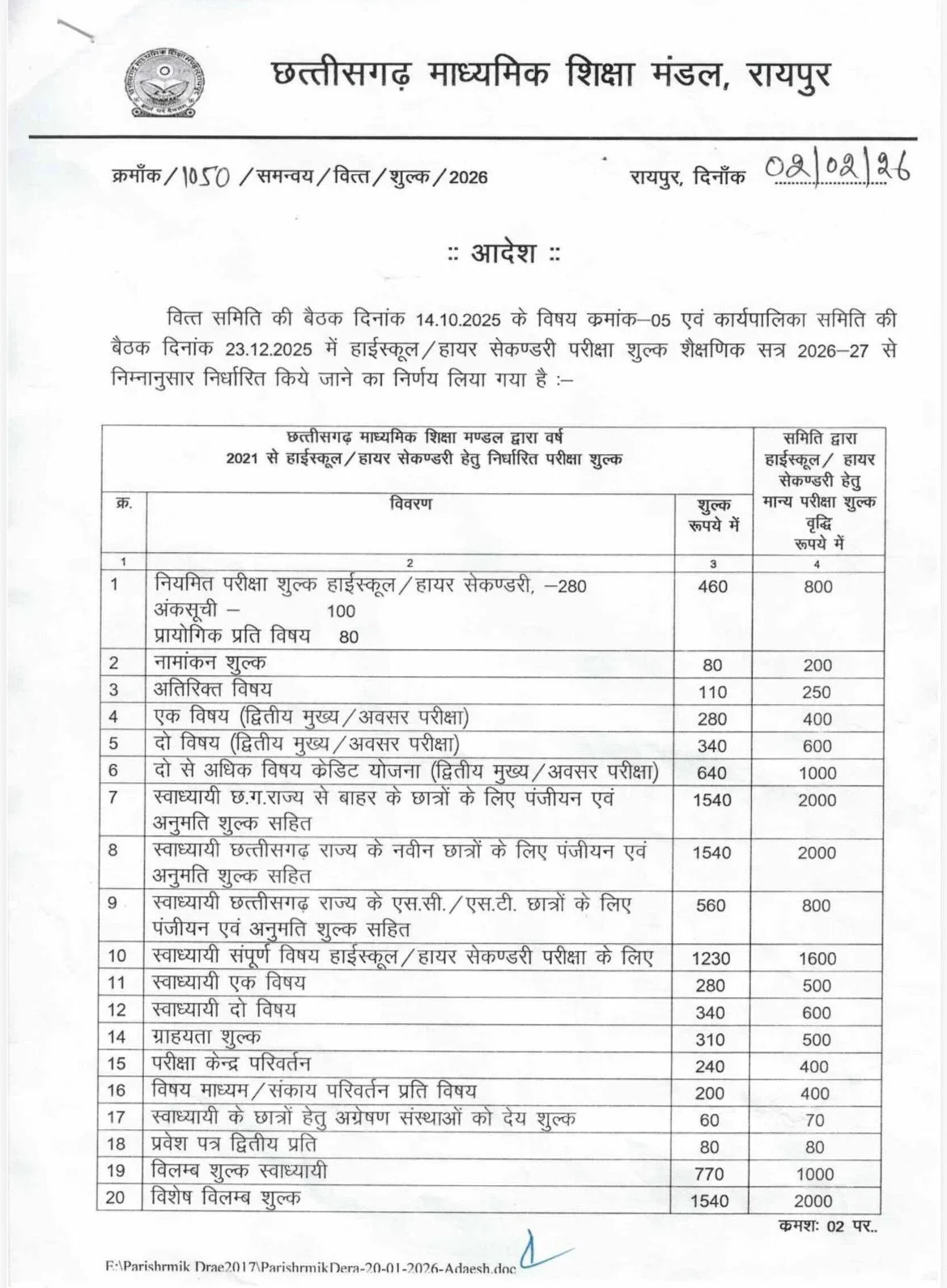वहीं बोर्ड परीक्षा के फार्म में 70 रुपए की बढ़ोतरी की गयी है। जानकारी के मुताबिक बढ़ा हुआ शुल्क शैक्षणिक सत्र 26 -27 में लागू होगी। माशिमं की सचिव पुष्पा साहू ने फीस बढोत्तरी के संबंध में आदेश जारी किया है। विलंब शुल्क भी बढ़ाया गया है। विशेष विलंब शुल्क अब 1540 रुपये से बढ़कर 2000 रुपये किया गया है।