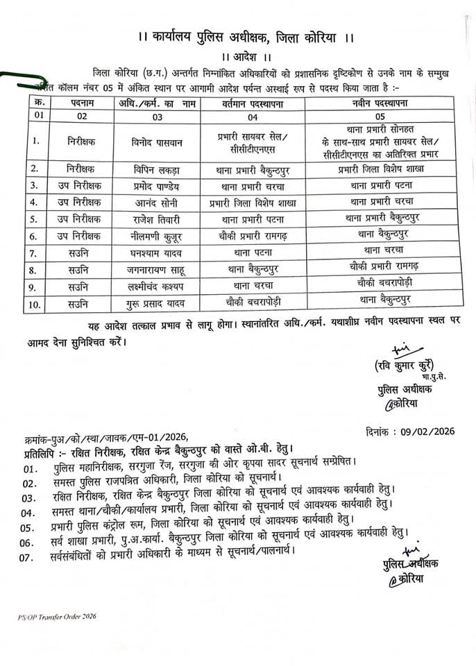 कोरिया : छत्तीसगढ़ के कोरिया जिले के पुलिस विभाग में तबादला एक्प्रेस दौड़ी है. बड़े पैमाने पर पुलिस अधिकारी-कर्मचारी का ट्रांसफर हुआ है. प्रशासनिक कसावट के उद्देश्य से 2 निरीक्षक, 4-4 एसआई और एएसआई समेत 69 पुलिसकर्मियों का पुलिस अधीक्षक रवि कुमार कुर्रे ने आदेश जारी किया है. जारी आदेश में पुलिसकर्मियों को नविन पदस्थापना दी गई है।