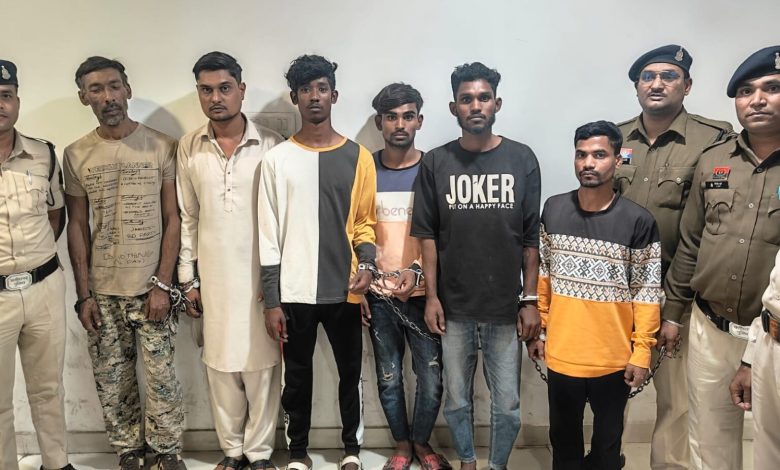 गिरफ्तार आरोपी — कमरान अब्बास (29), नवीन उर्फ नन्नू धीमर (19), लकी निषाद उर्फ छोटा चिकन (19), राकेश धीवर (24), अनिल धीवर (30) और हरिओम सोनकर (47)।