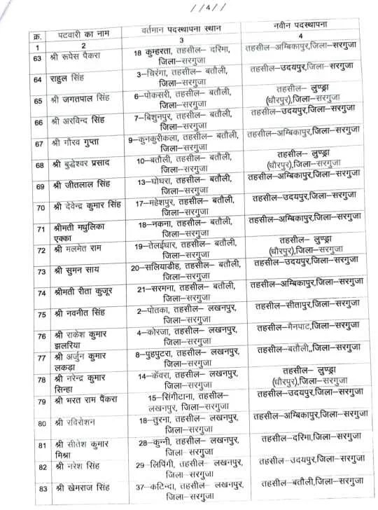 अंबिकापुर। जिले में बड़े पैमाने पर पटवारियों का तबादला किया गया है। लंबे समय से एक ही स्थान पर जमे 83 पटवारियों को इधर से उधर किया गया है। इस संबंध में कलेक्टर अजित वसंत ने आदेश जारी करते हुए शहर क्षेत्र में लंबे समय से पदस्थ पटवारियों को ग्रामीण क्षेत्रों में जिम्मेदारी सौंपी है। इस तबादला सूची को प्रशासनिक व्यवस्था को मजबूत करने और राजस्व कार्यों में पारदर्शिता लाने के उद्देश्य से जारी किया गया है।