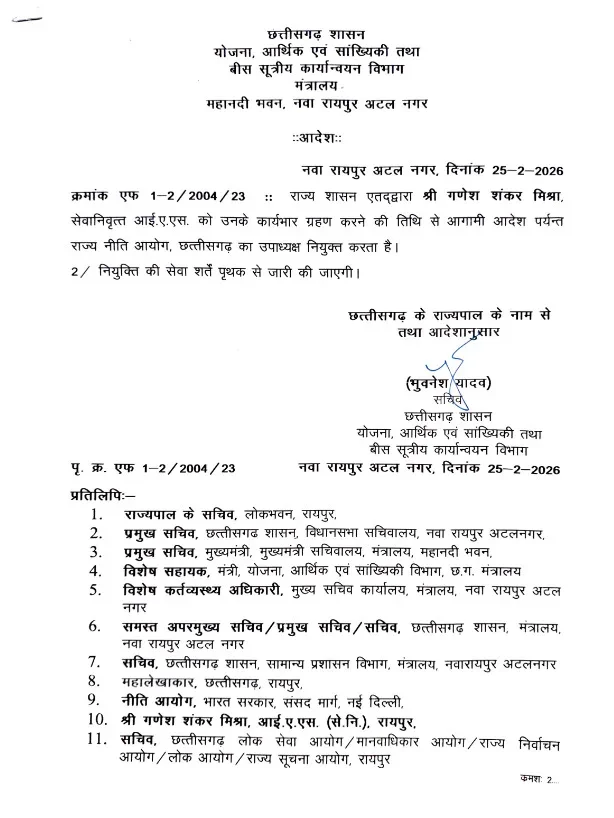रायपुर। राज्य सरकार ने पूर्व IAS गणेश शंकर मिश्रा को राज्य नीति आयोग का उपाध्यक्ष बनाया है। इस संबंध में योजना आर्थिक एवं सांख्यिकी विभाग ने आदेश जारी कर दिया है।