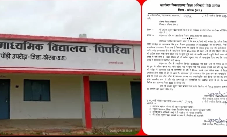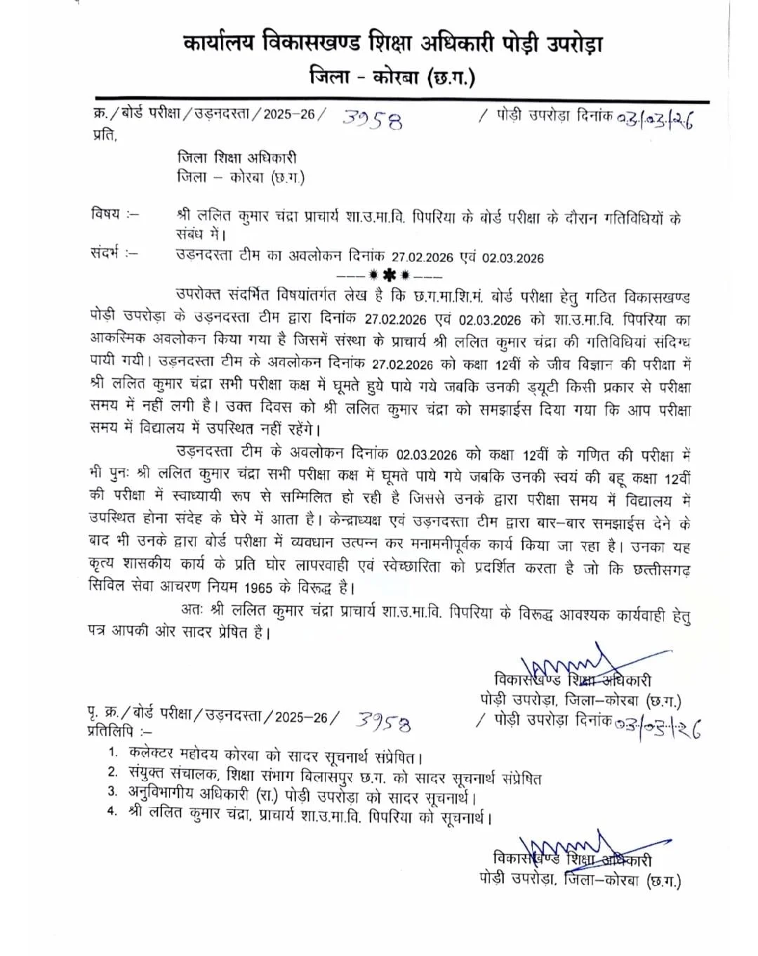 जानकारी के मुताबिक ये पूरा मामला पोड़ी- उपरोड़ा विकासखंड का है। बताया जा रहा है कि यहां के शासकीय उच्चतर माध्यमिक विद्यालय पिपरिया के प्रिंसिपल ललित कुमार चंद्रा के खिलाफ उड़नदस्ता की टीम ने डीईओं से शिकायत की है। टीम ने अपनी शिकायत में बताया कि 27 फरवरी 2026 और 2 मार्च 2026 को टीम ने परीक्षा केंद्र का आकस्मिक निरीक्षण किया था। निरीक्षण के दौरान 27 फरवरी को कक्षा 12वीं की जीव विज्ञान परीक्षा के समय प्रिंसिपल ललित कुमार चंद्रा को परीक्षा कक्षों में घूमते हुए देखा गया।