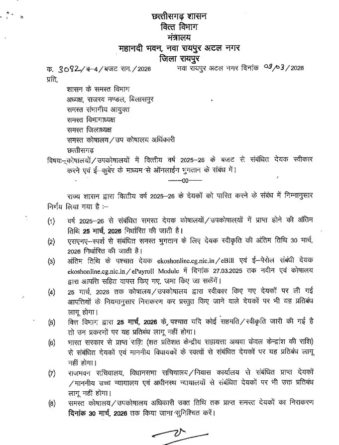 रायपुर। वित्त विभाग ने 2025-26 के लिए अंतिम बिल पेमेंट की समयावधि तय कर दी है। इसे लेकर सभी विभागों और कोषालय अधिकारियों को पत्र लिखा है। सभी पेमेंट के बिल कोषालय उप कोषालय में 25 मार्च तक अंतिम रूप से लिए जाएंगे और उनके भुगतान की अंतिम तिथि 30 मार्च होगी। इसके लिए 28 और 31 मार्च को सभी कोषालय खुले रखने कहा गया है।