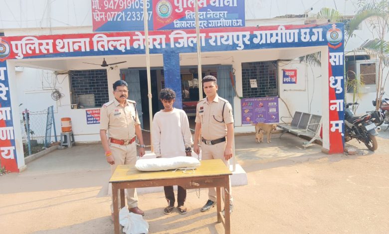 तिल्दा। थाना तिल्दा नेवरा पुलिस को गोपनीय सूचना प्राप्त हुई कि रेल्वे ओवरब्रिज के नीचे तिल्दा में उपरोक्त आरोपी जो अपने कमर में मादक पदार्थ गांजा छिपाकर विक्रय हेतु ग्राहक तलाश रहा है मौके से फरार होने की युक्तियुक्त अंदेशा पर तत्काल थाना तिल्दा नेवरा पुलिस के द्वारा विधिवत् कानूनी प्रक्रियाओं का पालन करते हुये तलाशी लेने पर आरोपी के पास से एक सफेद रंग के झोलानुमा थैला के अंदर रखा 02 किलो 267 मादक पदार्थ गांजा जिसे आरोपी के द्वारा बिशेष तरिके से सिलाई करके बनाकर पेट के ऊपर बांधकर ऊपर से पहने हुवे कपड़े से ढका हुवा था जिसकी कीमत 1,13,350/रू को जप्त किया गया जिसे उपरोक्त घटना सदर का अपराध पाये जाने पर आरोपी के विरूद्ध थाना तिल्दा नेवरा पुलिस द्वारा अपराध क्रमांक 120/2026 धारा 20(बी) नारकोटिक एक्ट कायम किया गया। आरोपी प्रज्वल किसन हुके को माननीय न्यायालय के आदेशानुसार न्यायिक रिमांड पर केन्द्रीय जेल रायपुर में दाखिल किया गया।