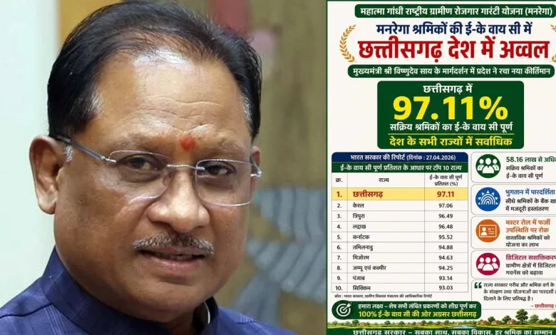 महात्मा गांधी राष्ट्रीय ग्रामीण रोजगार गारंटी योजना मनरेगा के तहत श्रमिकों की ई-केवाईसी (e-KYC) प्रक्रिया को पूरा करने में छत्तीसगढ़ ने देश भर में अग्रणी स्थान हासिल किया है। प्रदेश में लगभग 58.16 लाख से ज्यादा मजदूरों की डिजिटल वेरिफिकेशन (e-KYC) पूरी की गई हैए जो भुगतान में पारदर्शिता सुनिश्चित करती है। यह डिजिटल प्रक्रिया फर्जी जॉब कार्डों को हटाने और सीधे वास्तविक लाभार्थियों के बैंक खातों में मजदूरी पहुंचाने में मदद कर रही है।