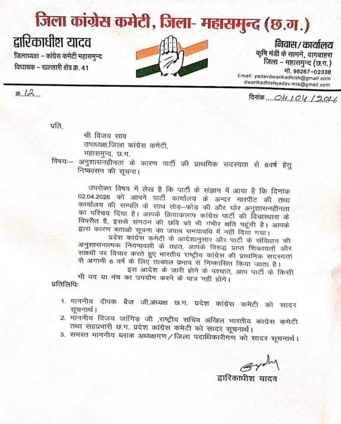 महासमुंद। महासमुंद जिले में जिला कांग्रेस कार्यालय में हुए मारपीट और तोड़फोड़ के मामले में कांग्रेस पार्टी ने सख्त कार्रवाई करते हुए जिला उपाध्यक्ष विजय साव को पार्टी से निष्कासित कर दिया है।
