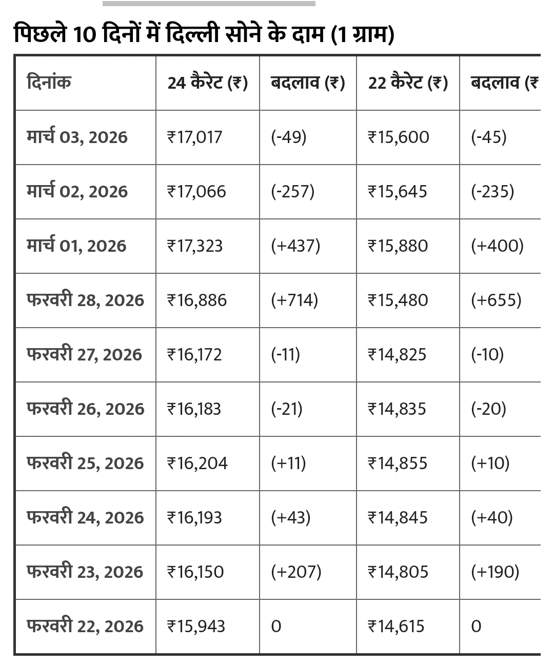 दिल्ली में 24 कैरेट सोने की कीमत आज 1,70,170 रुपये प्रति 10 ग्राम रही। 22 कैरेट का भाव 1,56,000 रुपये और 18 कैरेट का 1,27,670 रुपये प्रति 10 ग्राम है। मुंबई और अहमदाबाद में कीमतें लगभग समान हैं, जबकि चेन्नई में 24 कैरेट सोने का भाव 1,70,730 रुपये प्रति 10 ग्राम है। हैदराबाद, पुणे और बेंगलुरु में भी सोने की कीमतें 1,70,020 रुपये के आसपास हैं।
