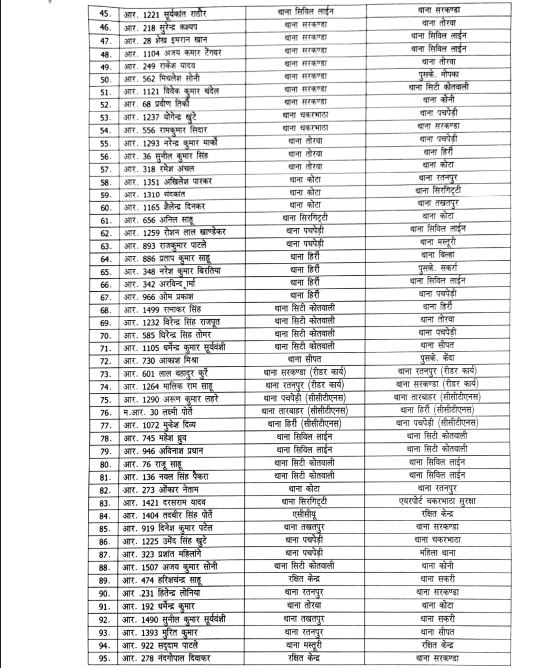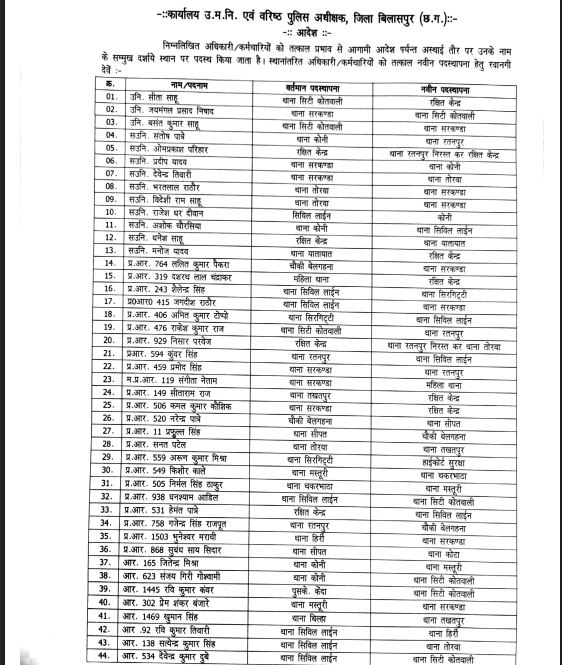 बिलासपुर। पुलिस विभाग में प्रशासनिक कसावट लाने के लिए लंबे समय से एक ही जगह में जमे पुलिसकर्मियों का बड़े पैमाने पर तबादला हुआ है। इस संबंध में सएसपी रजनेश सिंह ने आदेश जारी किया है। जारी आदेश के अनुसार, 3 उप निरीक्षक, 10 सहायक उप निरीक्षक, 23 प्रधान आरक्षक और 94 आरक्षकों का स्थानांतरण किया गया है।