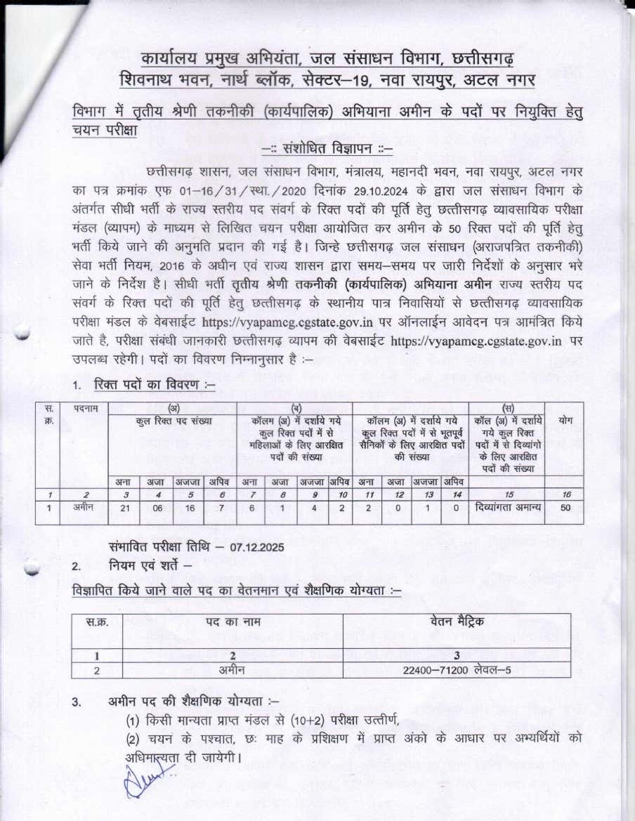 रायपुर। सरकारी नौकरी की तैयारी कर रहे युवाओं के लिए नौकरी पाने का सुनहरा अवसर आया है। दरअसल जल संसाधन विभाग में 12वीं पास युवाओं के लिए बंपर भर्ती निकली है। रिक्त पदों पर आवेदन के लिए उम्मीदवारों को 17 अक्टूबर 2025 तक का समय दिया गया है। वहीं, आवेदन में किसी प्रकार की त्रुटि होने पर 18 से 20 अक्टूबर तक सुधार करने का समय दिया गया है।