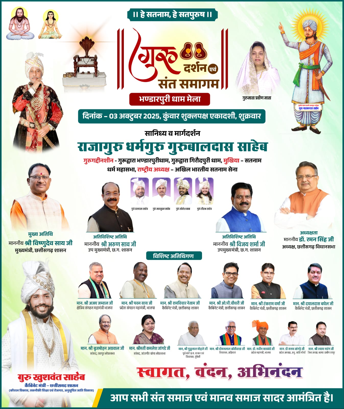 - सतनामी समाज के आदेशक निर्देशक एवं धर्मरक्षक राजागुरु, धर्मगुरु गुरु बालदास साहेब जी धर्ममंच से मानव समाज का करेंगे मार्गदर्शन