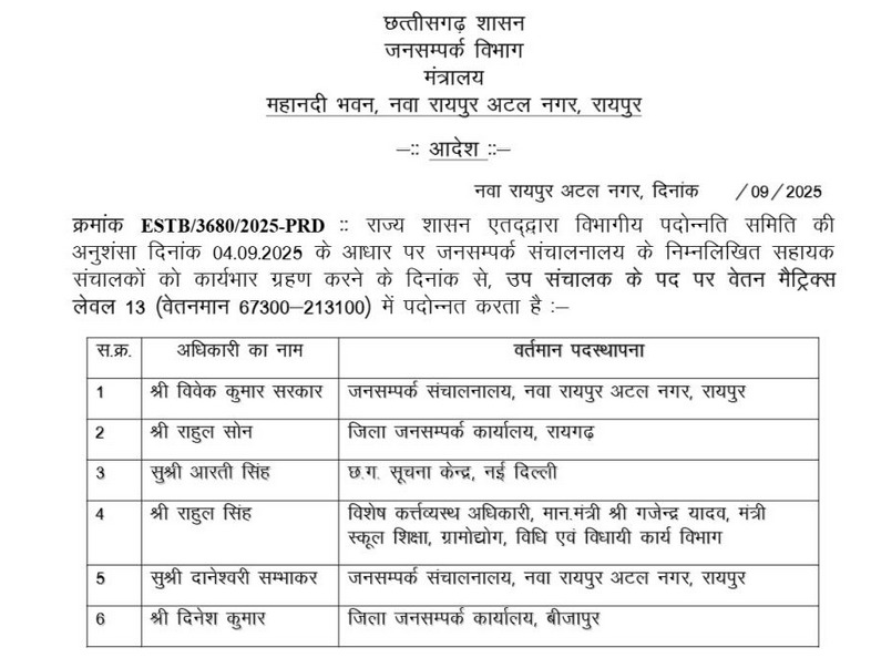 रायपुर। राज्य सरकार ने अधिकारियों को दीपावली के पहले प्रमोशन का तोहफा दिया है। सरकार ने डीपीसी की अनुशंसा के आधार पर छह सहायक संचालकों को उप संचालक के पद पर पदोन्नत किया है। हालांकि सभी पदोन्नत अफसरों को फिलहाल उनकी मौजूदा स्थलों पर ही पदस्थ रखा गया है।