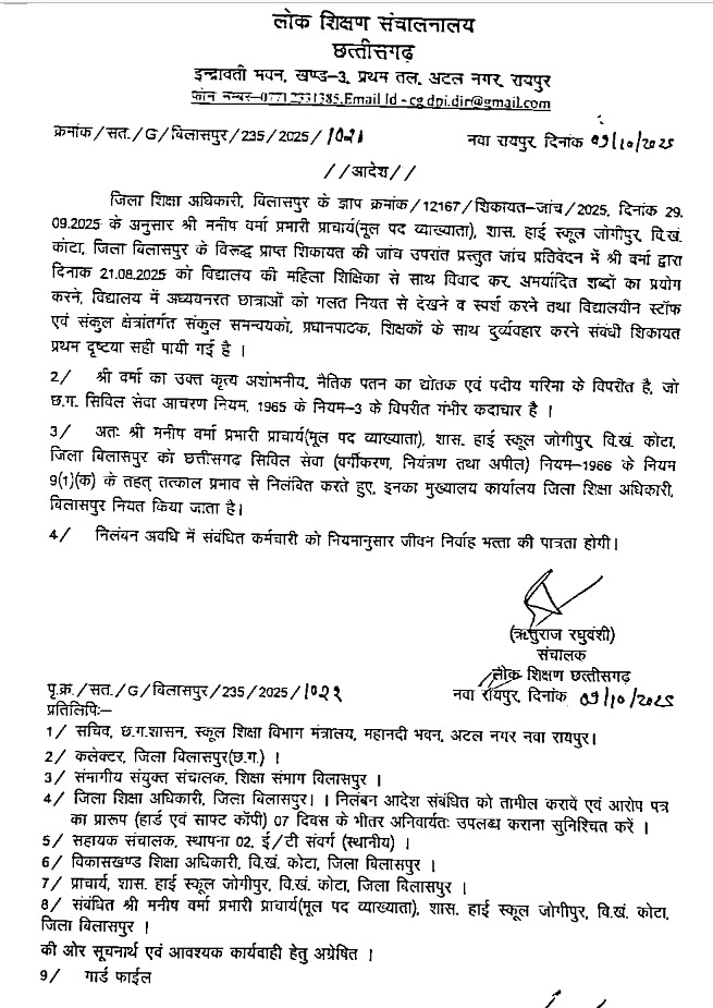 बिलासपुर। शासकीय हाई स्कूल, जोगीपुर (विकासखंड कोटा) के प्रभारी प्राचार्य मनीष वर्मा (मूल पद व्याख्याता) को तत्काल प्रभाव से निलंबित कर दिया है। डीपीआई ने इसे लेकर आदेश जारी किया है। डीपीआई ने ये कार्रवाई जिला शिक्षा अधिकारी, बिलासपुर द्वारा जारी ज्ञापन क्रमांक 12167/शिकायत-जांच/2025 दिनांक 29 सितंबर 2025 के तहत की गई है।