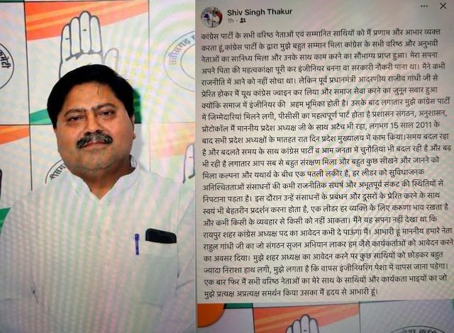 शिव सिंह ठाकुर ने सोशल मीडिया के जरिए दी जानकारी में कहा है कि रायपुर शहर अध्यक्ष के लिए आवेदन दिया है लेकिन निराशा हाथ लगी, सपोर्ट नहीं मिला, अब वापस इंजीनियरिंग के पेशे में लौटूंगा। जो पूरा समय कांग्रेस को देता था नहीं दे पाऊंगा।