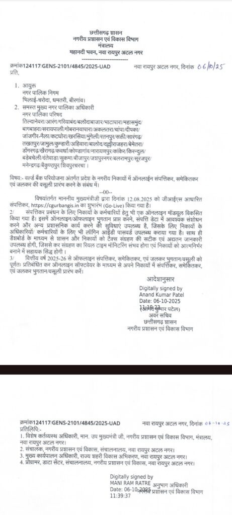 CG ब्रेकिंग: अब सभी निकायों को लेना होगा ऑनलाइन टैक्स, सरकार ने जारी किया आदेश…
