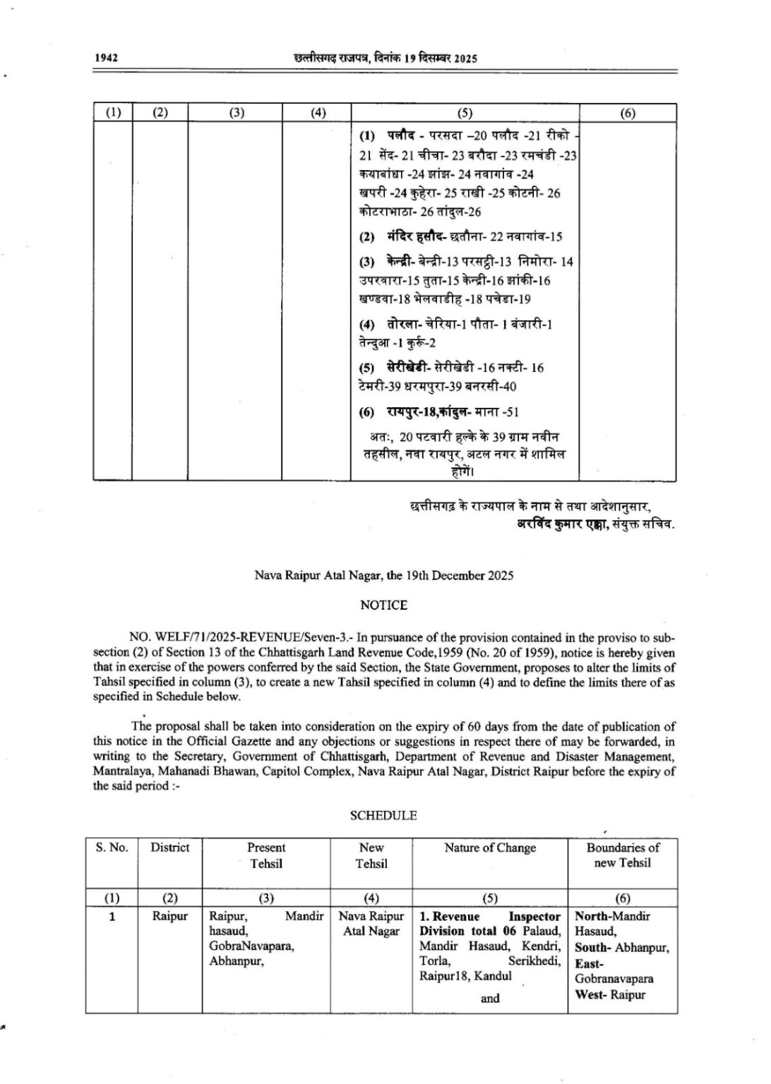 जारी अधिसूचना के अनुसार राज्य सरकार ने रायपुर जिले में एक नई तहसील गठित करने और उसकी सीमाएं निर्धारित करने का प्रस्ताव रखा है।