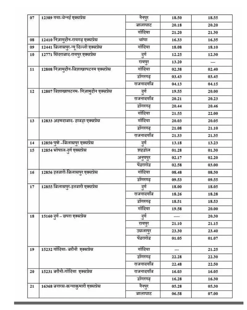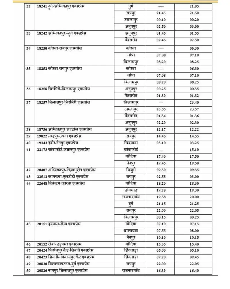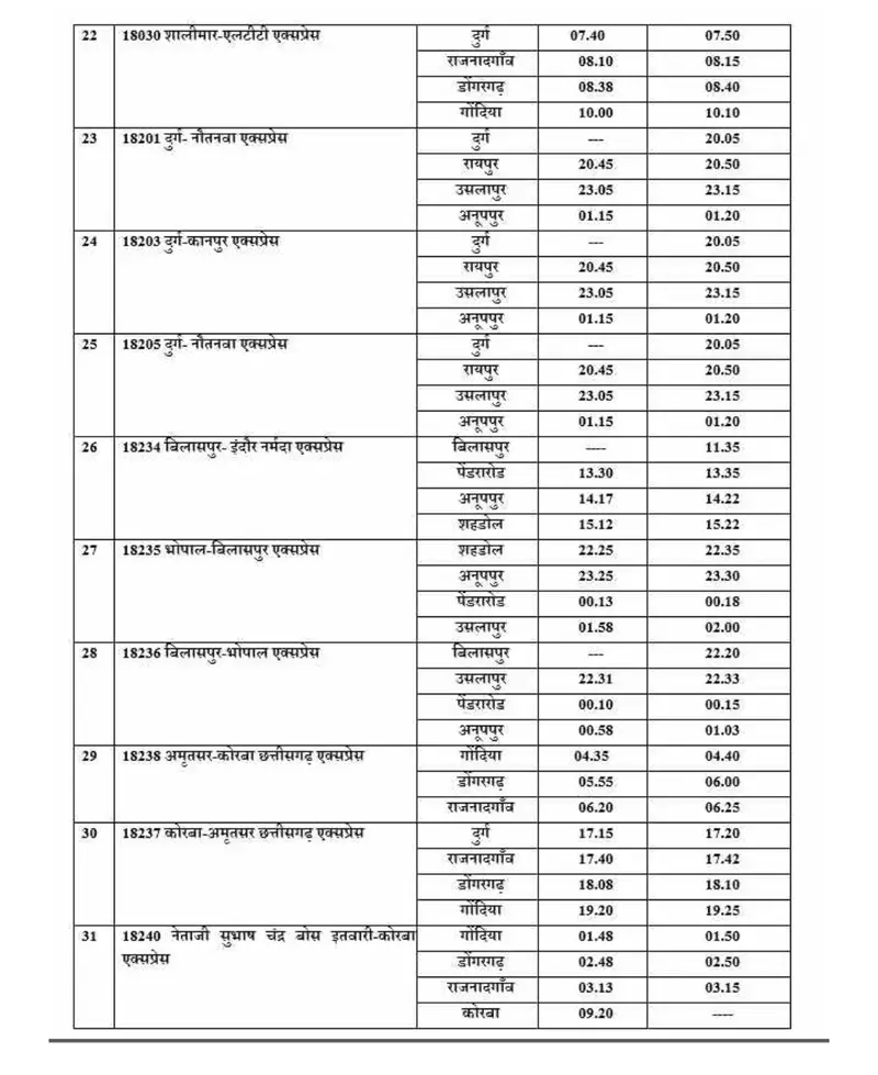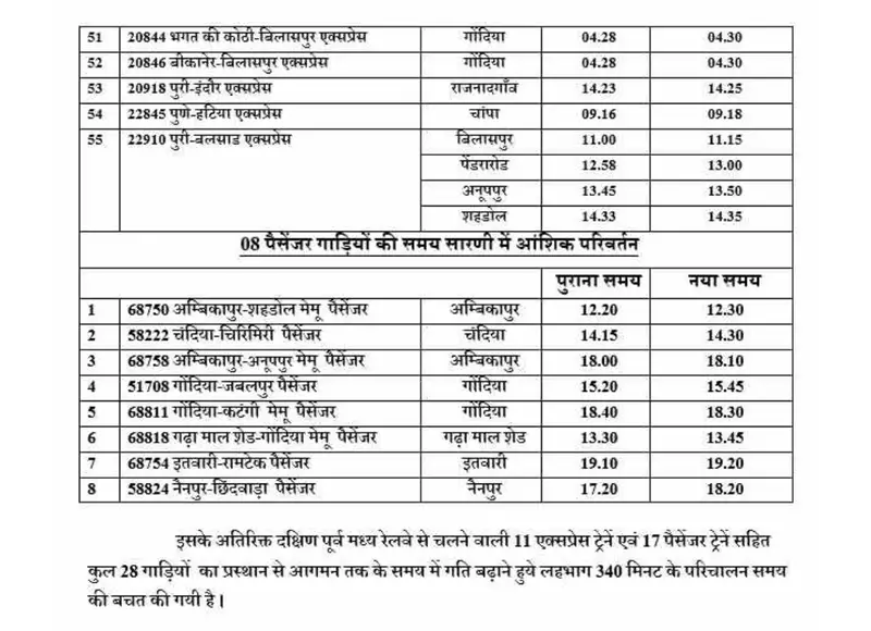 नई दिल्ली :– 1 जनवरी से ट्रेनों के समय में बदलाव होने जा रहा है। रेलवे ने हर साल की तरह इस बार भी आधारभूत संरचना के विकास को ध्यान में रखते हुए भारतीय रेलवे की समय सारिणी में आंशिक परिवर्तन किया है। इसके तहत दक्षिण पूर्व मध्य रेलवे जोन में कुल 55 ट्रेनों के समय में बदलाव किया गया है। यात्रियों को सलाह दी गई है कि यात्रा से पहले नई समय सारिणी की जानकारी जरूर ले लें, ताकि किसी तरह की असुविधा न हो।