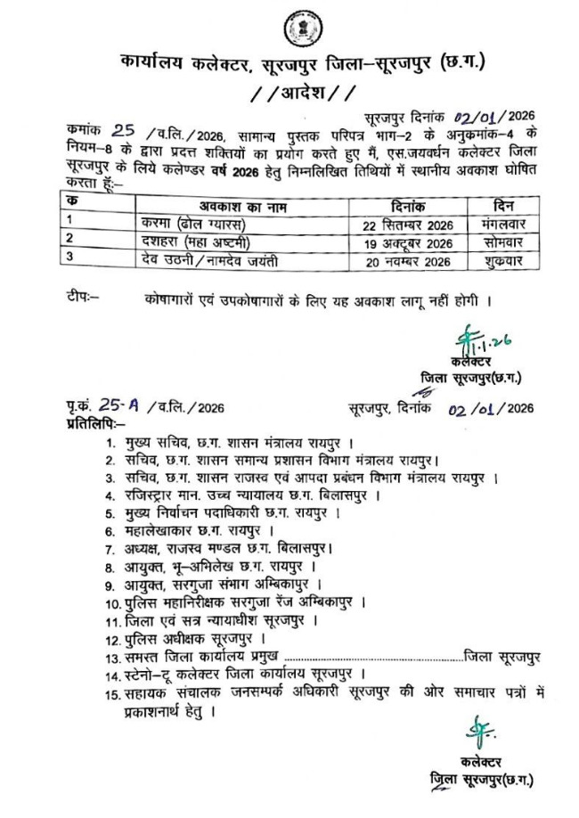 नये साल की शुरुआत हो चुकी है। साल 2026 में मिलने वाली छुट्टियों का कैलेंडर भी जारी हो गया है। इस बार पिछले वर्ष के बराबर ही अवकाश मिलेगा। वहीं जिलों में प्राथमिकताओं के आधार पर स्थानीय अवकाश दिये जायेंगे। स्थानीय अवकाश की सूची जिलों से कलेक्टर प्राथमिकताओं के आधार पर जारी कर रहे हैं। सूरजपुर जिले से स्थानीय अवकाश की सूची जारी की गयी है।
