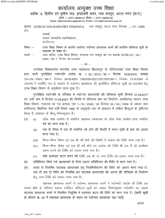 उच्च शिक्षा संचालनालय, इन्द्रावती भवन, नवा रायपुर द्वारा जारी आदेश के अनुसार पदोन्नत प्राध्यापकों की वरिष्ठता का निर्धारण 01 अप्रैल 2017 एवं 01 अप्रैल 2023 की स्थिति के आधार पर किया गया है। वरिष्ठता निर्धारण में लोक सेवा आयोग से चयन, विषयवार नियुक्ति, कार्यभार ग्रहण की तिथि, संविलियन एवं नियमितीकरण की तिथि जैसे मापदंडों को शामिल किया गया है।