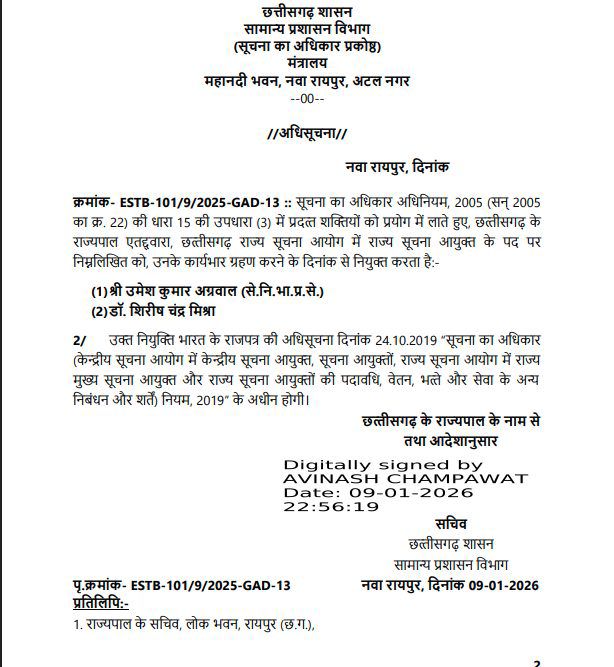 यह आदेश छत्तीसगढ़ के राज्यपाल के नाम से तथा उनके आदेशानुसार जारी किया गया है।