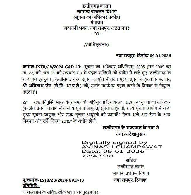 रायपुर, छत्तीसगढ़ शासन ने राज्य सूचना आयोग में महत्वपूर्ण नियुक्तियां करते हुए पूर्व मुख्य सचिव अमिताभ जैन को राज्य का नया मुख्य सूचना आयुक्त नियुक्त किया है।