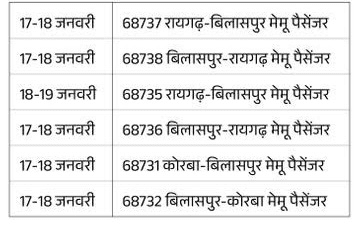 17 और 18 जनवरी को बिलासपुर-रायगढ़-बिलासपुर और बिलासपुर-कोरबा-बिलासपुर मेमू लोकल ट्रेन दो दिन नहीं चलेंगी। इसके चलते रोजाना ट्रेन में सफर करने वाले यात्रियों को मुसीबतों का सामना करना पड़ेगा। बिलासपुर रेल मंडल के कोटमीसोनार-जयरामनगर सेक्शन के बीच ट्रैफिक ब्लॉक लेकर मेंटेनेंस वर्क किया जाएगा। इसके चलते दक्षिण पूर्व मध्य रेलवे से चलने और गुजरने वाली कुछ ट्रेनें प्रभावित रहेगी।