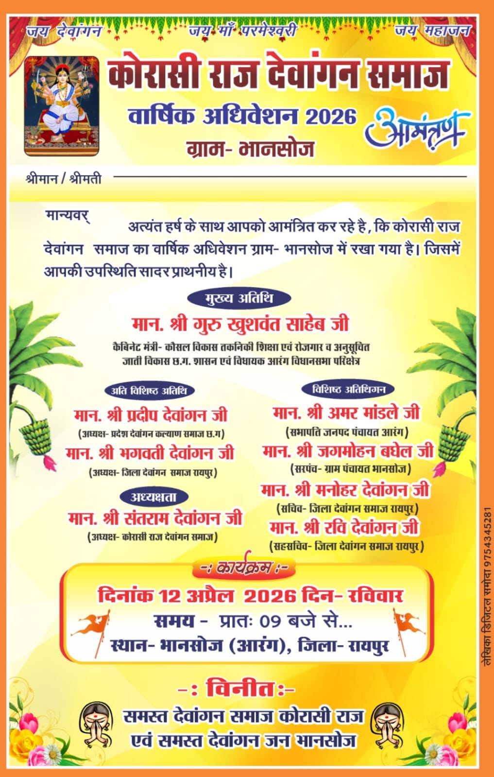 आरंग। जिला रायपुर अंतर्गत कोरासी राज देवांगन समाज का भव्य वार्षिक अधिवेशन दिनांक 12 अप्रैल 2026 को हाई स्कूल परिसर ग्राम भानसोज (आरंग )में सुबह 9 बजे से आयोजित होगा।इस कार्यक्रम के मुख्य अतिथि गुरु खुशवंत साहेब कैबिनेट मंत्री -कौशल विकास, तकनीकी शिक्षा एवं रोजगार व अनुसूचित जाति विकास छत्तीसगढ़ शासन होंगे। अति विशिष्ट अतिथि के रूप में प्रदेश देवांगन कल्याण समाज के अध्यक्ष प्रदीप देवांगन व जिला देवांगन समाज रायपुर के अध्यक्ष भगवती देवांगन होंगे।कार्यक्रम की अध्यक्षता संतराम देवांगन अध्यक्ष कोरासी राज देवांगन समाज करेंगे। विशिष्ट अतिथियों में अमर लाल मांडले सभापति जनपद पंचायत आरंग व जगमोहन बघेल सरपंच ग्राम पंचायत भानसोज होंगे। विशिष्ट अतिथि के रूप में जिला देवांगन समाज के सचिव मनोहर देवांगन व सह सचिव रवि देवांगन विशिष्ट अतिथि होंगे। मुख्य आकर्षण का केंद्र आईएएस अधिकारी अश्वनी देवांगन को समाज के द्वारा समाज के गौरव के रूप में “मां परमेश्वरी रत्न”से सम्मानित किया जाएगा।कार्यक्रम का शुरुआत सुबह 9 बजे से मां परमेश्वरी पूजा व वंदना के साथ शुरू होगा। तत्पश्चात अतिथियों व पदाधिकारियों का स्वागत सत्कार, समाज के प्रतिभावान छात्र-छात्राओं को प्रशस्ति पत्र व मैडल से सम्मानित करना,राज के प्रत्येक गांव के ग्रामीण अध्यक्ष का सम्मान, कोषाध्यक्ष द्वारा आय -व्यय विवरण प्रस्तुत करना, सामाजिक प्रस्ताव व चर्चा एवं सामाजिक प्रकरणों की सुनवाई किया जायेगा। कार्यक्रम का संचालन कोरासी परिक्षेत्र के सचिव सोहन लाल देवांगन समोदा के द्वारा किया जायेगा।